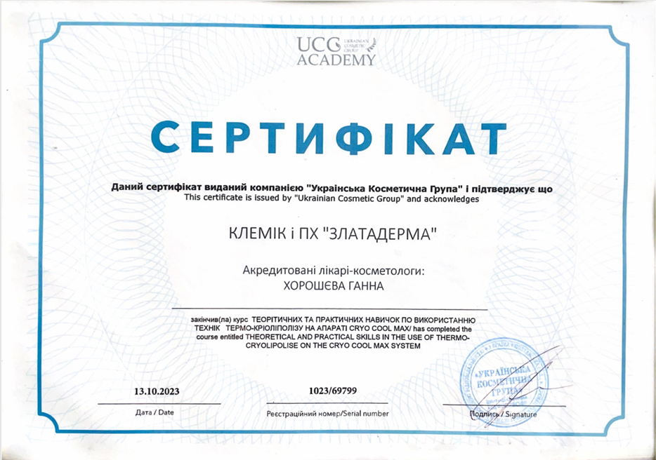 • 2018 р. — навчання апаратам CRY COOL MAX (Криолиполиз);
