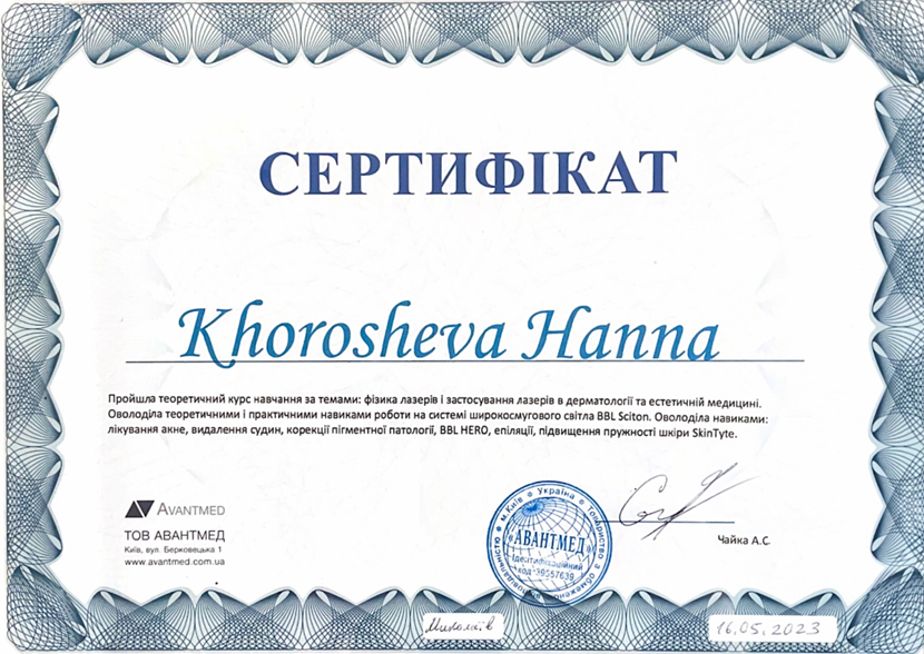 • 2017 р. — навчання апаратам Sciton BBL;