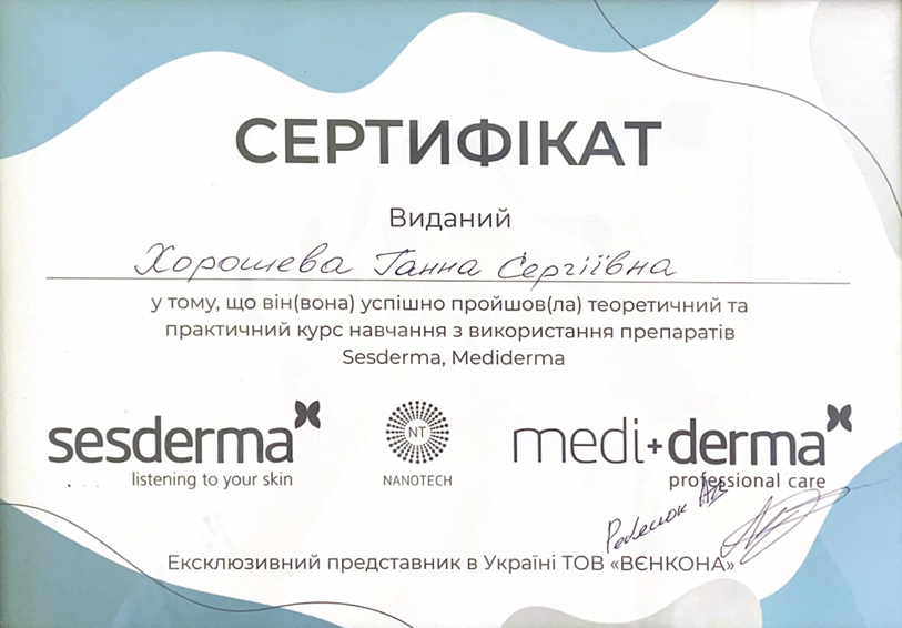 • 2017 р. — пройшла курс "Дерматоскопія в косметології та естетичній медицині";